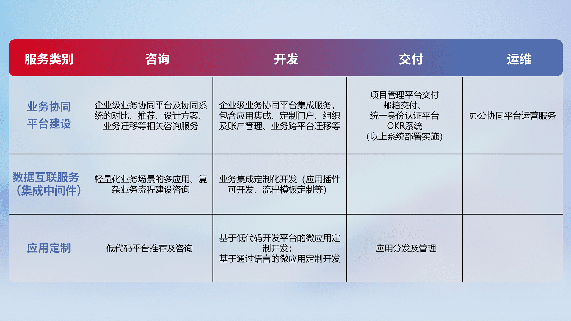 针对钉钉、、企微、、、、IDaas等平台级产品提供产品的规划、、、、方案、、交付、、、定制化开发等服务,,实现如统一协同办公、、、、智能客户服务、、混合会议管理、、智能数据查询、、、等业务场景,,,,实现数字化转型。。。。