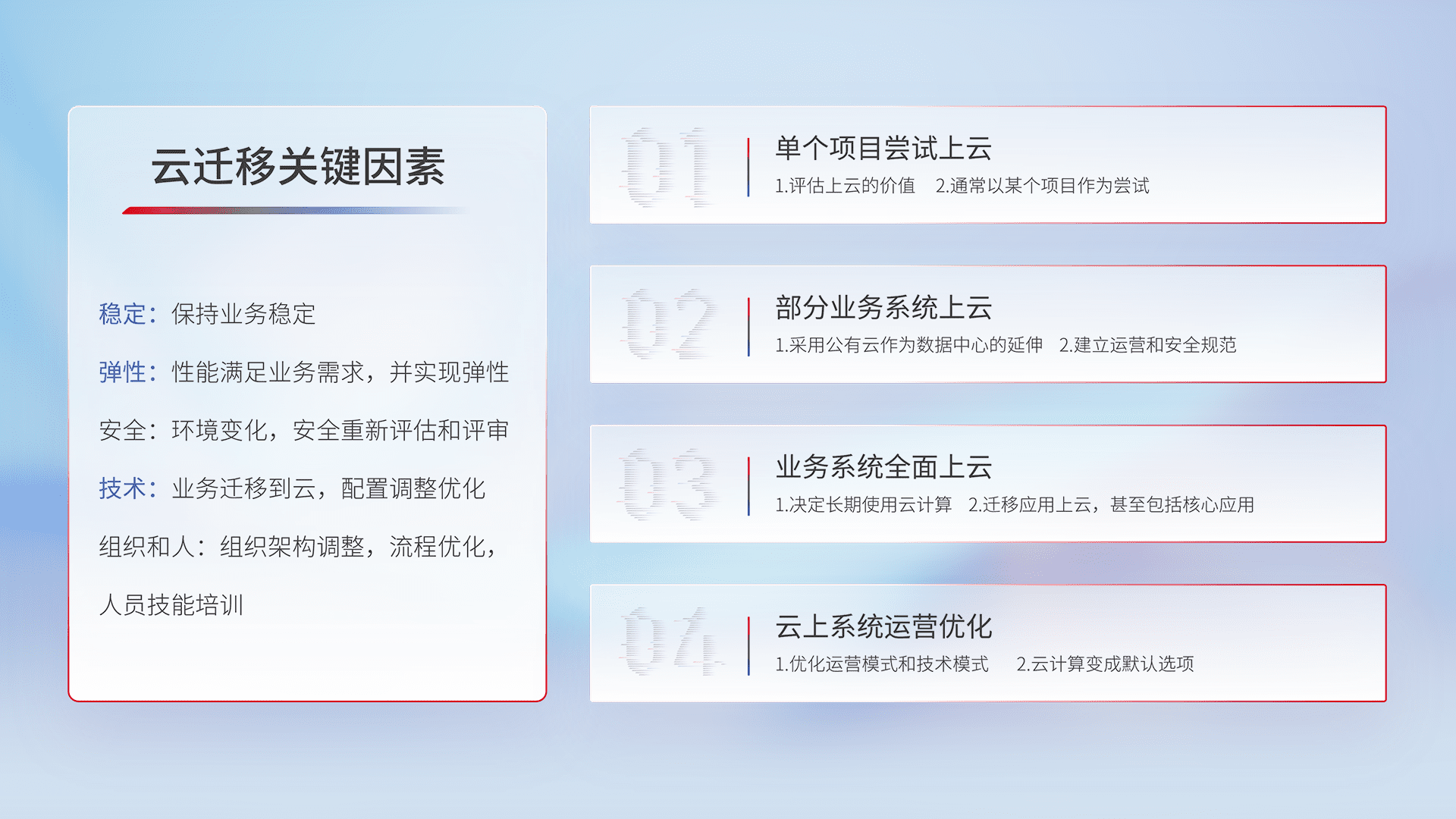 结合实际业务,,,从规划设计、、云平台选型、、、、云原生改造、、数据迁移、、集成交付,,迁移全过程为客户识别最佳上云路径,,,做好风险识别管理,,,,设计网络架构、、身份权限、、、安全审计合规、、操作审计、、日志审计、、、、监控告警策略、、多站点容灾设计等,,对云上基础设施进行整体规划,,提升IT治理水平,,,以满足弹性、、高可用、、高性能的需求。。。